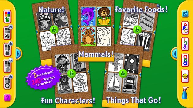 Little artists can also choose the smiley face to let their creativity go wild, using any colors they choose. Even then they hear the name pronounced for each color selected. That helps reinforce colors and distinguishes between light and dark shades. Scroll back and forth between images with ease. To spritz away the filled-in colors and try again, touch the spray bottle icon. Like the final result? Share it with Grandma or others by Facebook or e-mail without even leaving the app. Once your little learner has experienced the free pictures, choose from many more available as in-app purchases, including 12 more pictures in the full Mammals gallery, plus four other galleries--Nature, Favorite Foods, Fun Characters, and Things That Go--each with 16 pictures.