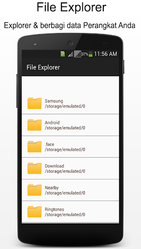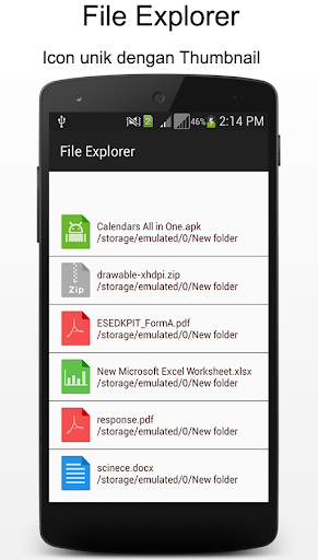File Explorer adalah fitur lengkap software file manager. Ini memungkinkan Anda mengelola file Anda dengan mudah. Ini adalah baik mencari file manager menampilkan isi dalam pandangan kendit .Anda dapat mengakses semua file Anda dari memori perangkat atau kartu SD. Ini adalah sederhana dan yang paling mudah untuk menggunakan file alat manajemen browsing.