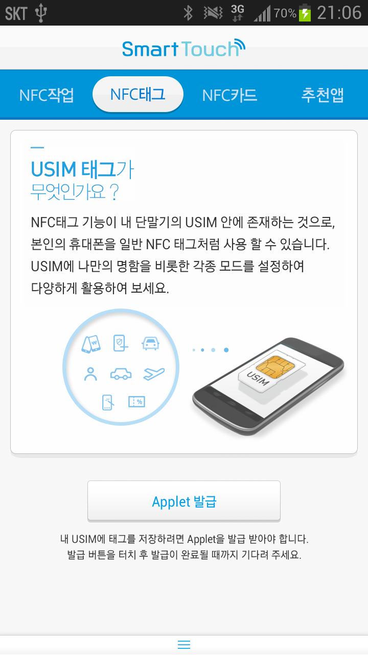 - NFC 태그 기능이 내 휴대폰의 USIM안에 존재하는 것으로, 내 USIM에 태그 기능을 저장하여 휴대폰을 일반 NFC 태그 처럼 사용할 수 있습니다.