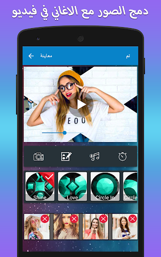 دمج الصور مع الاغاني في فيديو‎ هو تطبيق لإنشاء وتحرير الفيديو من الصور والموسيقى ومشاركة قصة فيديو مذهلة مع الأصدقاء!