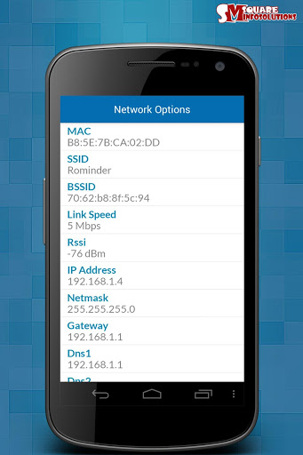 ∙ Wifi info­ MAC, SSID, link speed, IP address, Server address, etc.