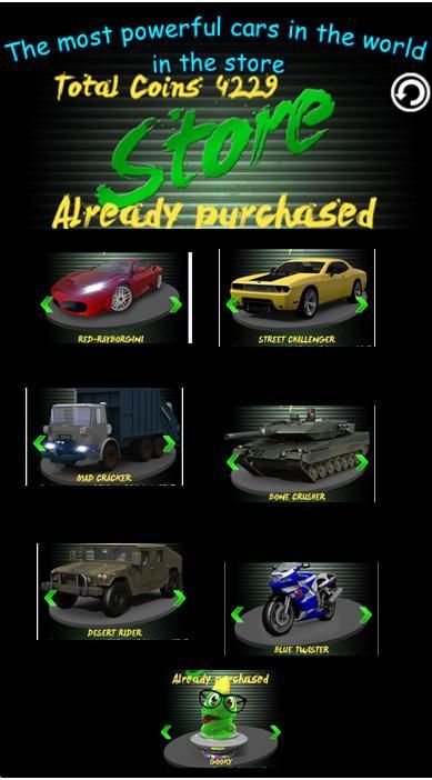 Aplikasi ini telah tersedia mobil galeri di mana Anda dapat membeli mobil preferensi Anda dengan uang yang Anda menang. Anda dapat memilih: Power, kecepatan atau aerodinamika tergantung mobil, truk, atau sepeda Humvee yang Anda inginkan.
