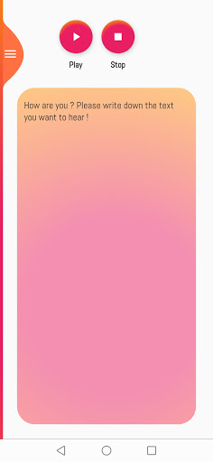 Readah: Teks untuk bicara membantu Anda mendengarkan teks yang Anda berikan dalam aplikasi.Ini memberi Anda bidang di mana Anda dapat menempatkan teks Te yang ingin Anda dengarkan, dan dua tombol untuk bermain dan berhenti mendengarkan.