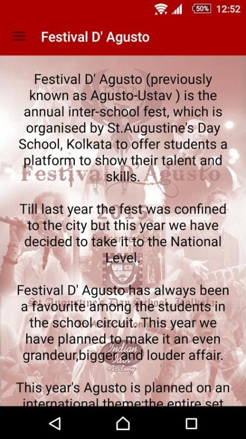 Festival D' Agusto (previously known as Agusto-Ustav ) is the annual inter-school fest, which is organised by St.Augustine's Day School, Kolkata to offer students a platform to show their talent and skills.