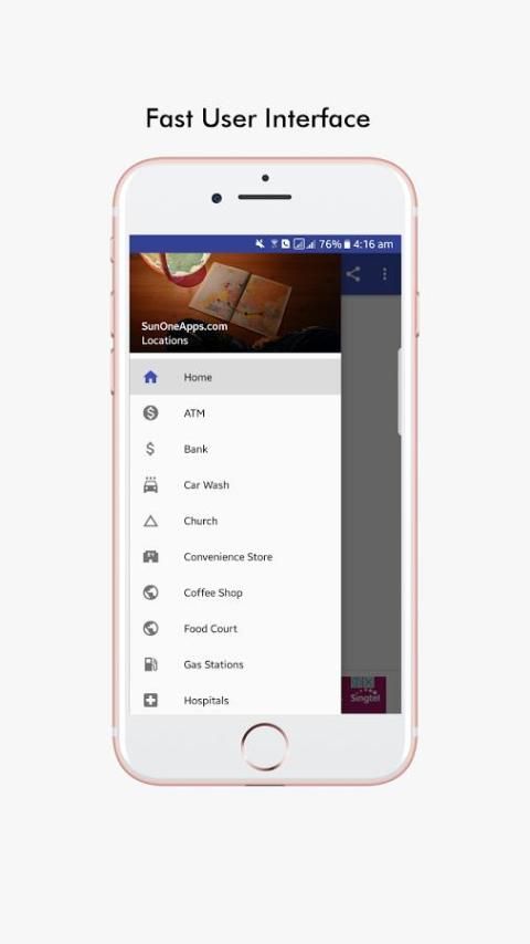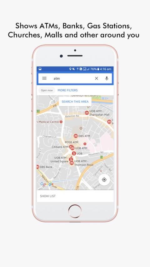 menampilkan cepat restoran, hotel, ATM, rumah sakit, gereja, toilet, halte, toko-toko, bank, cuci mobil, mal, kantor polisi, pasar, toko-toko kopi, tujuan wisata, taman, perpustakaan, kompleks olahraga dan lain-lain di dekat Anda!