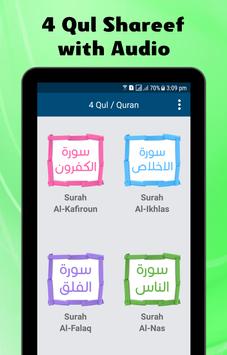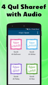 4 Qul Shareef of Quran Audio is an Islamic Application which contains Four Holy Surahs of Al-Quran Majeed, i.e. Al-Kafiroon, Al-Ikhlas, Al-Falaq and An-Nas.