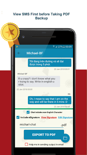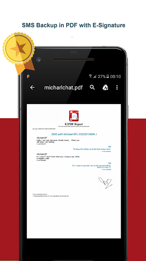 e2pdf Pro adalah aplikasi yang sangat sederhana namun sangat produktif yang memungkinkan Anda untuk mengambil cadangan percakapan SMS Anda dengan yang Anda cintai sekali dan kemudian tidak pernah kehilangan itu lagi. Yang harus Anda lakukan adalah memilih percakapan dan sebelum mengambil cadangan dalam PDF, seluruh percakapan muncul di layar Anda, Anda akan memasukkan nama file output dan dengan satu klik cadangan akan dibuat. Cadangan SMS dimungkinkan dengan 3 langkah sekarang. File cadangan yang dihasilkan dapat disimpan pada drive lokal atau dalam email dan dapat dibagikan secara instan.