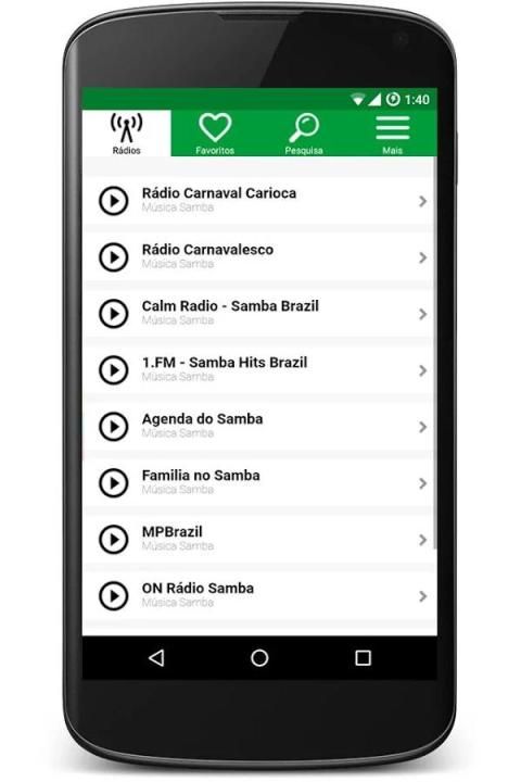 samba musik terbaik ditularkan dari berbagai kota dari Brasil dan negara-negara yang tersebar genre musik. Anda dapat mendengarkan musik samba oleh seniman dan kelompok samba yang paling representatif sub-genre seperti bossa nova, pagoda, lagu samba, samba-entredo, bukit samba dan Partido-alto samba. Dengan yang terbaik samba musik mencapai merger dengan funk, jazz, reggae, rock dan banyak lagi. Dalam aplikasi ini, Anda dapat mendengar musik terbaik Brasil untuk menari, musik Brasil yang paling representatif di suara eksponen besar dari genre yang unik budaya dari Rio de Janeiro (Brazil).