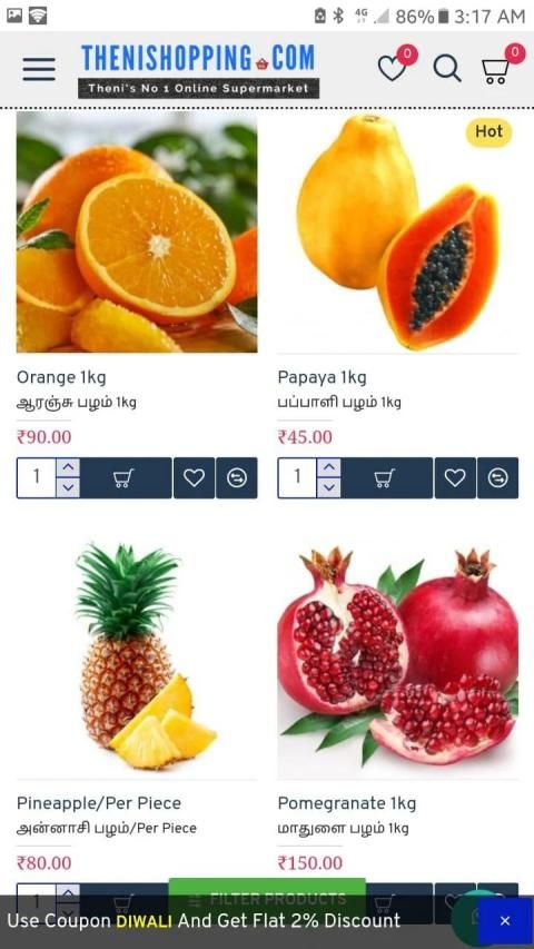 We established www.thenishopping.com in 2019, with a vision to make quality Grocery, Vegetables, Fruits and Meat products available to the customers in Theni District at affordable prices. We make this possible by sourcing directly from our network of farms supplying fruits, vegetables and groceries. The scale of operation allows us to offer unparalleled freshness.