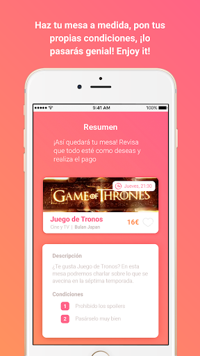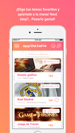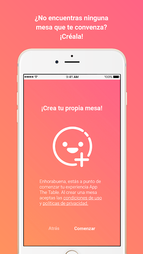 Con app the table podrás encontrar mesas creadas por nuestros usuarios en tus restaurantes favoritos donde podrás apuntarte, conocer gente con tus mismas aficiones, gustos, preferencias. ¿No encuentras ninguna mesa que te convenza? Créala tu mismo! desde la aplicación podrás crear mesas con los títulos que te apetezcan y así atraer a la mesa a gente como tú, que les apetezca charlar, debatir, buscar opiniones, crear contactos.. Úsalas como mas te guste!