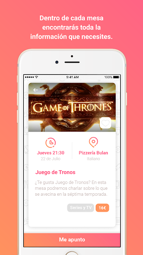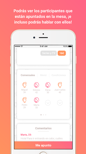 Dentro de la información encontrarás detalles como fecha, hora, lugar, menú, condiciones, e incluso una vez apuntado, podrás hablar con la gente que ya está apuntada en la mesa.
