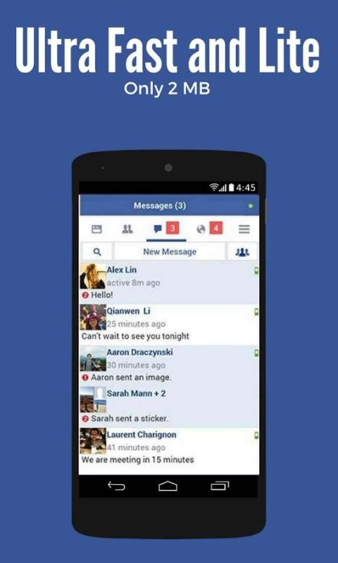 - Hanya 3MB dan 20MB kira-kira setelah menginstal dibandingkan dengan ratusan MB dengan Facebook resmi dan Messenger.
