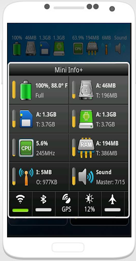 Keep your device under control with System Info Widget. Hard Disk space, memory and CPU usage, battery charge, network and other system details - all information about your device in one application.System Info Widget features:- Visual display of system resources' usage- RAM and CPU usage monitor- Details about battery charge- Disk space monitor- OS and network information