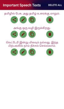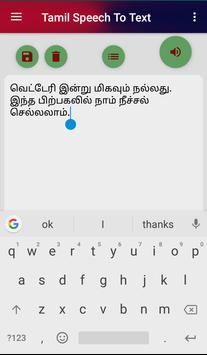 Tamil Speech To தமிழ் Text ~ Speak in தமிழ் App is easy Google Tamil Speech to Text. Speak out any Words and Sentences in Tamil and it will be written in Tamil Text. You can save your speech text. Copy to clipboard. Edit, Delete and Share.