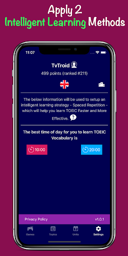 - Pelajari kosakata TOEIC® lebih mudah dengan memainkan game yang menakjubkan dan menarik