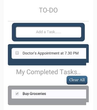ToDo List is simple task management tool where you can put down your daily tasks. It helps you to get organised, simplify your life, and to get things done. You can mark tasks as complete after you are done with them and if you want to forget about completed tasks then you can clear all completed tasks. ToDo List is considered most efficient way to improve productivity in your day to day life.
