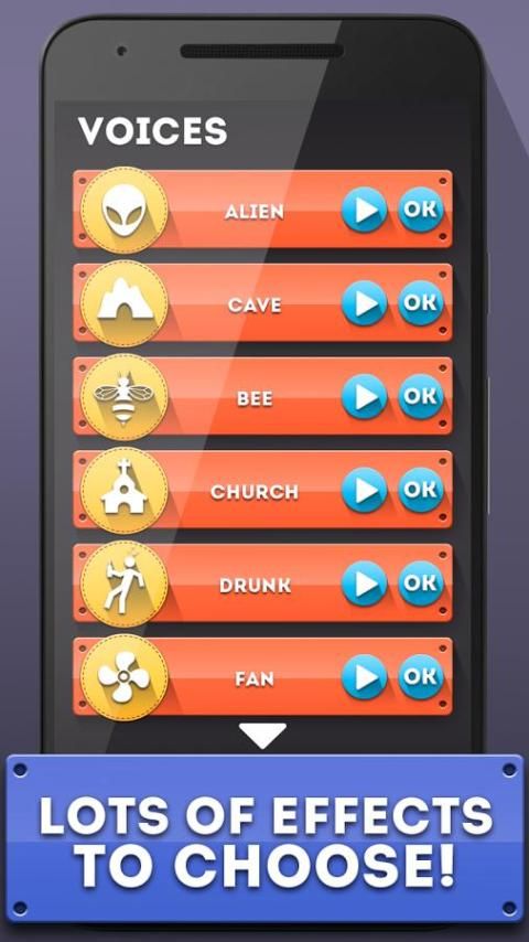 -Effects Untuk memodifikasi suara: alien, lebah, mabuk, Katedral, di bawah air, robot, Rakasa, saraf, mikrofon, suara digital, minion, gua, helium, heksafluorida, luar angkasa, terbang, hanya vokal, anak, bayi, sihir , walkie-talkie, mundur dan mendistorsi suara.