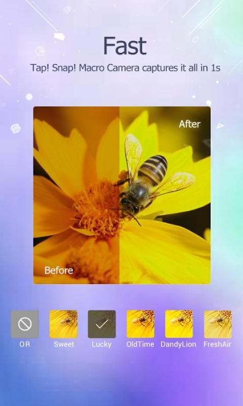 Makro Camera adalah kamera sederhana dan indah untuk menangkap dan berbagi momen indah Anda. Anda dapat menggunakan Macro Kamera untuk: