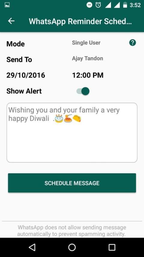 WhatsApp tidak memungkinkan mengirim pesan secara otomatis untuk mencegah aktivitas spamming. WhatsApp Reminder Scheduler akan mengingatkan Anda pada waktu yang ditetapkan untuk mengirim pesan.