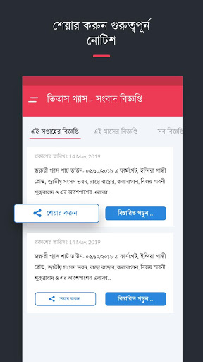 The Titas Gas Transmission and Distribution Company is the largest natural gas distributor in Bangladesh. Titas Gas Notice app is created in order to let people know about the events and other important notices about their service. Set the notification button ON to get instant message about all notices from Titas Gas.