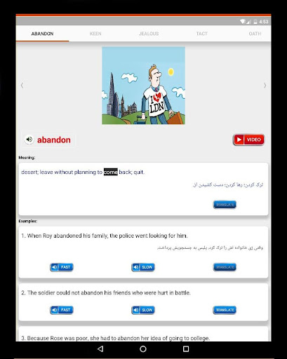 Setiap kata yang berarti disajikan dengan gambaran yang relevan, dan kemudian setidaknya dua video benar-benar gambar bagaimana kata tersebut digunakan percakapan kata nyata.