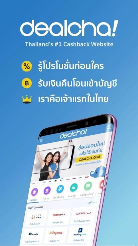 Dealcha adalah Situs web Cashback pertama di Thailand. Kami ingin menciptakan pengalaman belanja online yang bagus untuk pelanggan Thailand. Dealcha menawarkan penawaran terbaik dari toko-toko. Dan kembalikan secara tunai kepada pengguna kami, jadi saat berbelanja online, jangan lupa untuk menggunakan Dealcha! Anda akan menerima hingga 20% uang tunai kembali Selain itu, Anda akan memperbarui promosi dan diskon terbaru dari lebih dari 100 toko terkemuka. Unduh sekarang!