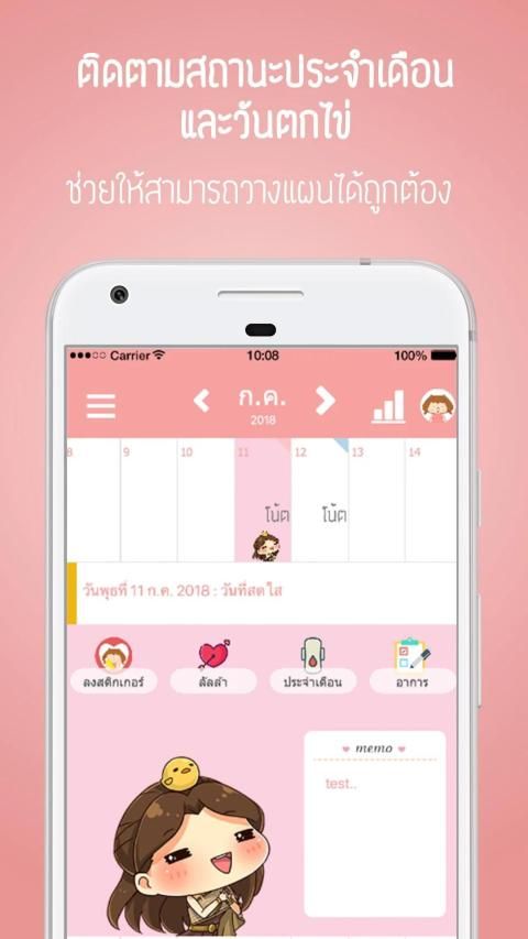 ไดอารี่น่ารักๆสำหรับคุณผู้หญิง ช่วยเตือนและติดตามสถานะการตกไข่และประจำเดือน สามารถบันทึกอาการ, อารมณ์, อุณหภูมิร่างกายและน้ำหนักในแต่ละวัน รวมทั้งบันทึกข้อความและไดอารี่ต่างๆประจำวัน เพื้อการดูแลตัวเองและวางแผนให้ดียิ่งขึ้น