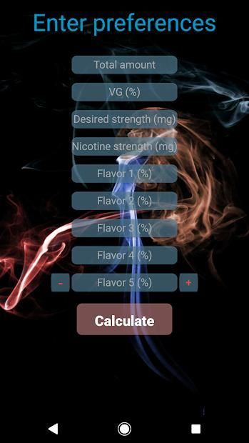 Aplikasi ini memungkinkan Anda menghitung jumlah e-cair dengan mudah jika Anda tidak memiliki cukup gliserin nabati, propilen glikol, nikotin, atau rasa. Ini juga menyediakan kalkulator sederhana.