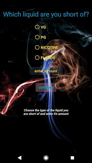 This app lets you easily calculate e-liquid amount if you don't have enough vegetable glycerin, propylene glycol, nicotine or flavour. It also provides the simple calculator.
