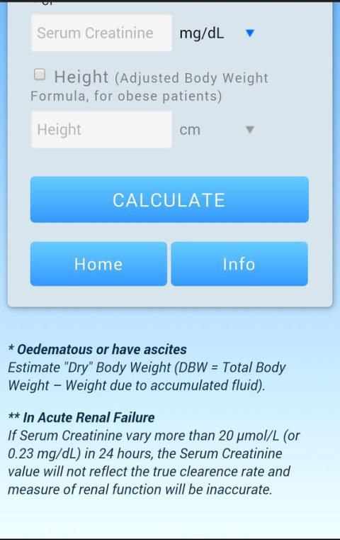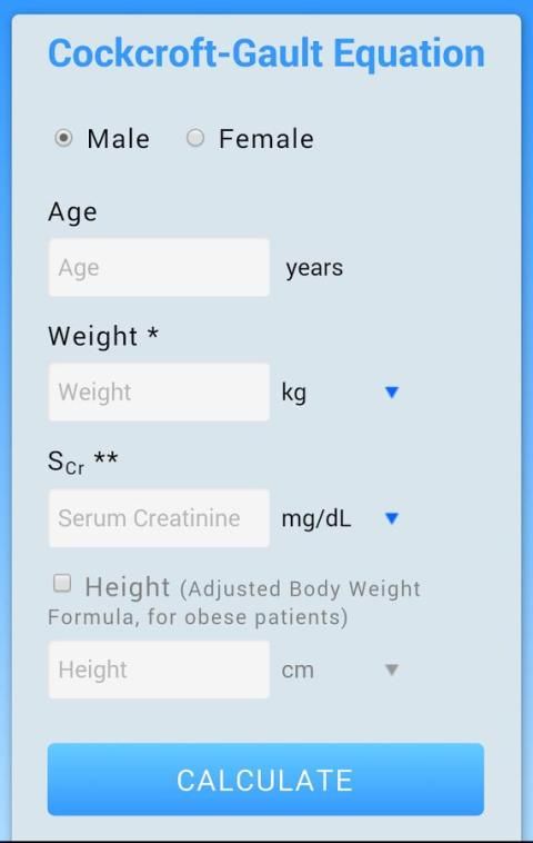 - Cockcroft-Gault Persamaan: termasuk pilihan tinggi opsional untuk "berat badan disesuaikan" formula dan perhitungan yang lebih akurat pada pasien obesitas;