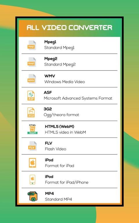 Konverter video untuk Android dapat mengkonversi hampir semua format video ke mpeg4 dan h264 video, termasuk asf, avi, divx, flv, m2v, m4v, mjpeg, mkv, mov, mpg, ogg, ogv, rm, rmvb, webm, wmv, dv4 dll.