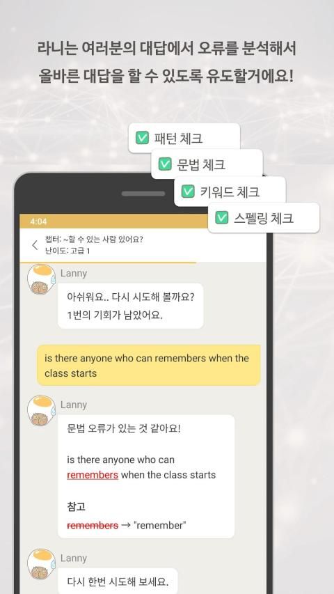 챗봇 라니는 다양한 난이도의 질문을 던지며 여러분이 열심히 배운 표현들을 완전히 익숙하게 사용할 수 있도록 도와줄거예요!