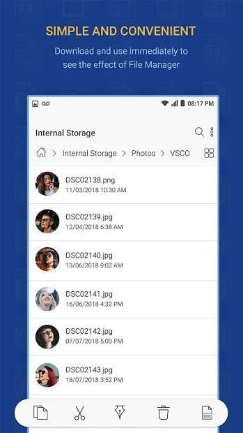Manajer file menyediakan file yang cukup lengkap termasuk operasi: membuat direktori, membuat file, menyalin file, memindahkan, memotong, menempelkan file, menghapus, mengganti nama, mengubah ukuran file, membagi file berbagi ... untuk Anda mudah dengan mudah manajer memori di juga SD atau perangkat lain.