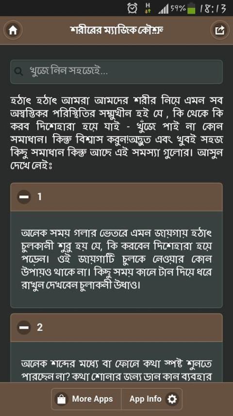হঠাৎ হঠাৎ আমরা আমদের শরীর নিয়ে এমন সব অস্বস্তিকর পরিস্থিতির সম্মুখীন হই যে, কি থেকে কি করব দিশেহারা হয়ে যাই - খুঁজে পাই না কোন সমাধান. কিন্তু বিশ্বাস করুন! অদ্ভুত এবং খুবই সহজ কিছু সমাধান কিন্তু আছে এই সমস্যা গুলোর.এই অ্যাপ এ দেখে নেই সমাধান গুলো.