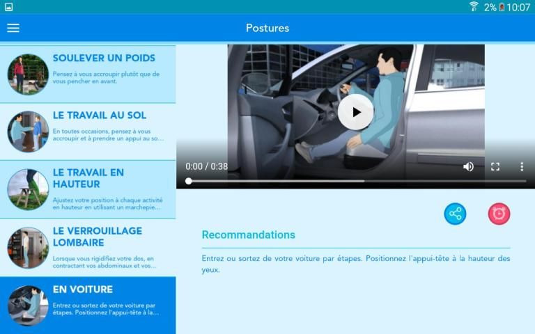 Visionnez des vidéos de bonnes postures pour le bureau, le jardin, la voiture… Des conseils pour adopter les bonnes postures et éviter les mauvaises postures. En fonction de vos besoins au quotidien, vous pouvez programmer des rappels de bonne posture pour ne plus oublier comment bien se tenir.