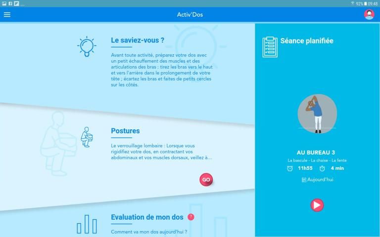 Activ'Dos diciptakan oleh Asuransi Kesehatan untuk membantu Anda menjaga dan menjaga punggung Anda setiap hari. Untuk ini, aplikasi menawarkan beberapa fitur.