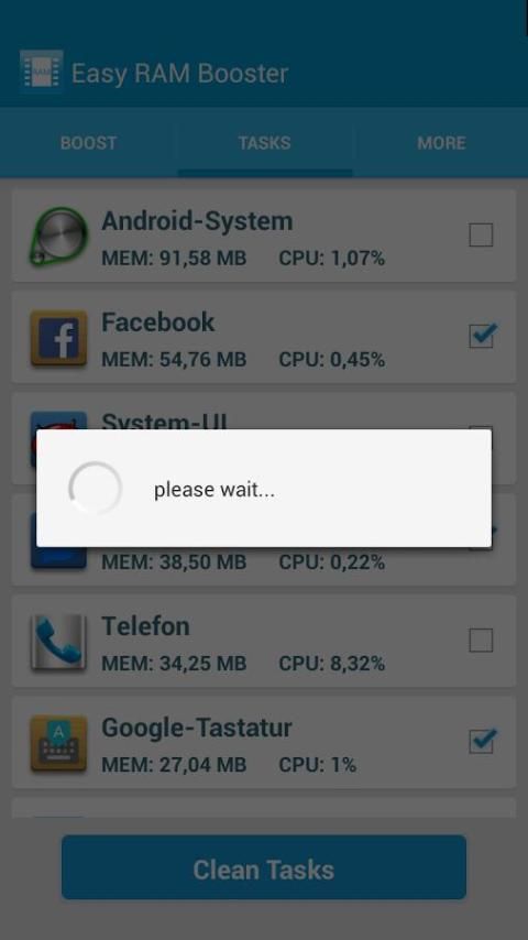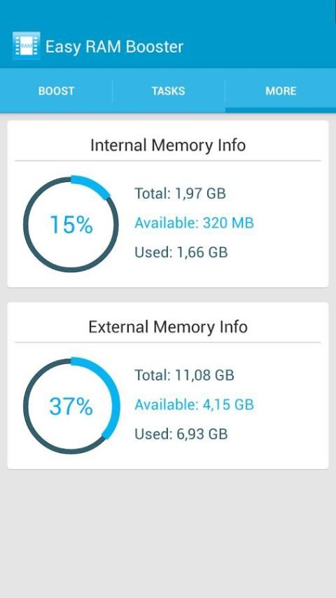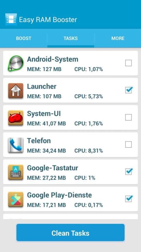 Anda dapat membuat ponsel Anda dengan sentuhan belaka cepat. Tekan tombol dan menghapus proses yang tidak perlu berjalan. Dalam Tugas tab memungkinkan Anda untuk menekankan untuk membersihkan proses individu dari memori RAM. Lebih pengendara tahu bahwa Anda. Juga pada status memori internal dan eksternal Anda