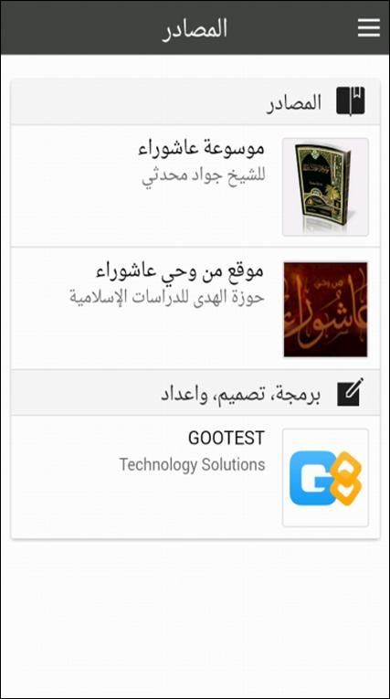 - المصادر: يحتوي على مصادر المواضيع ومعلومات عامة عن التطبيق، بالاضافة الى زر المشاركة لنشر معلومات عامة عن التطبيق من خلال تطبيقات التواصل الاجتماعي.