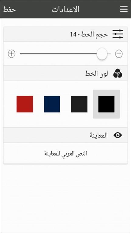 - الاعدادات: التحكم في حجم الخط ولونه.