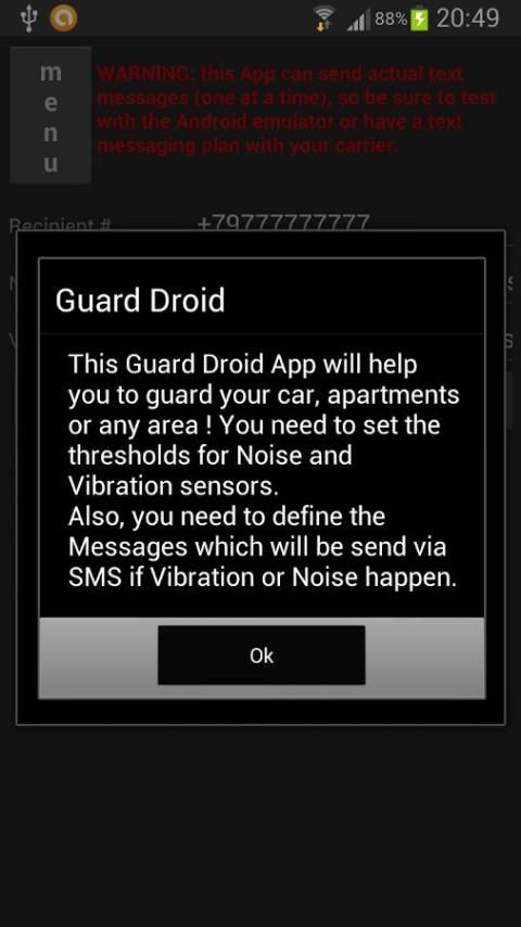 Droid App Garda ini akan membantu Anda untuk menjaga mobil Anda, apartemen atau daerah manapun! Anda perlu mengatur ambang batas untuk Kebisingan dan Getaran sensor.