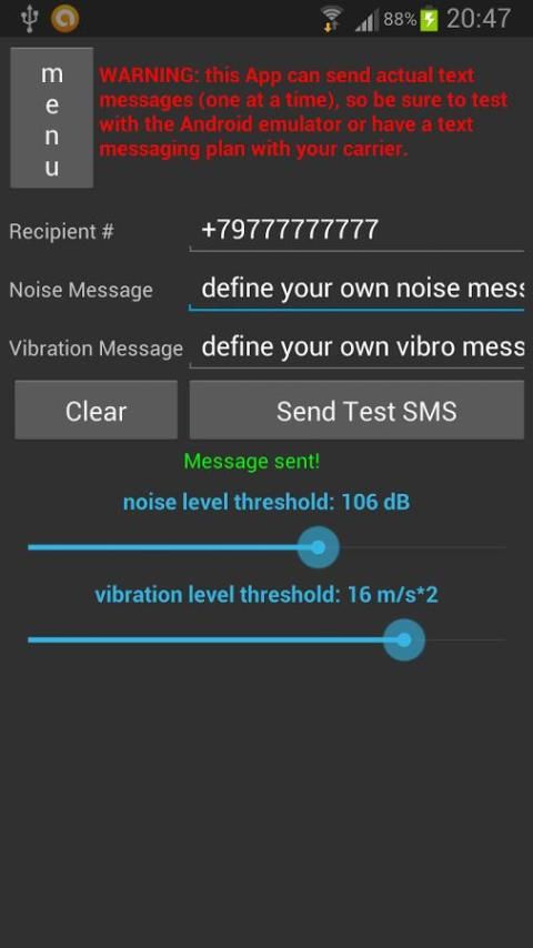 Juga, Anda perlu menentukan Pesan yang akan dikirimkan melalui SMS jika Getaran atau Kebisingan terjadi.