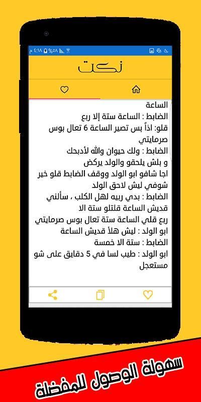 Aplikasi ini juga berisi lelucon Mesir dan lelucon dan lelucon Irak Ardineh lucu lelucon Maroko baru dan lelucon Mahshchin Teluk lelucon lelucon manis dan pendek Palestina nya.