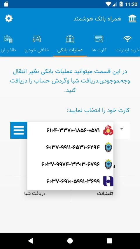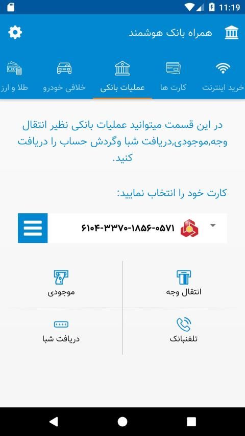 ? انجام کليه خدمات بانکي شامل موجودي ، گردش حساب ، انتقال وجه ، شبا ( اين خدمات براي بخشي از بانک ها نيازمند رمز اينترنت بانک مي باشد )