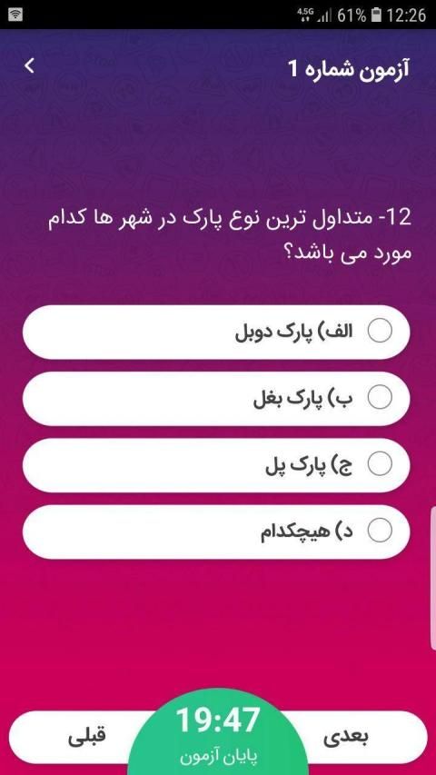 شما 30 دقیقه وقت دارید تا به آزمون پاسخ داده و پس از پاسخ بر روی دکمه پایان آزمون کلیک کرده و نتیجه آزمون خود را همراه با پاسخ های صحیح ببینید اگر بیش از 3 پاسخ غلط داشته باشید در آزمون قبول نمی شوید