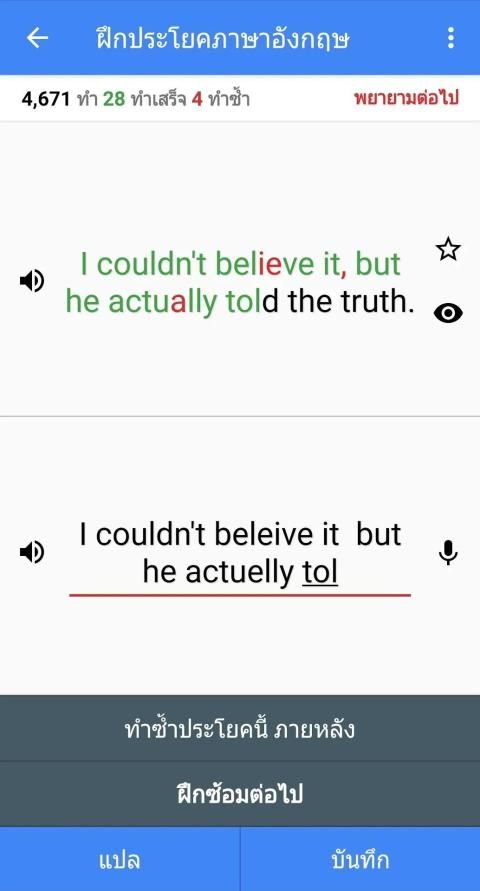 Listen to a sentence in English and then correctly guess each word in the sentence. You won't be shown the Thai translation of the sentence until the end.