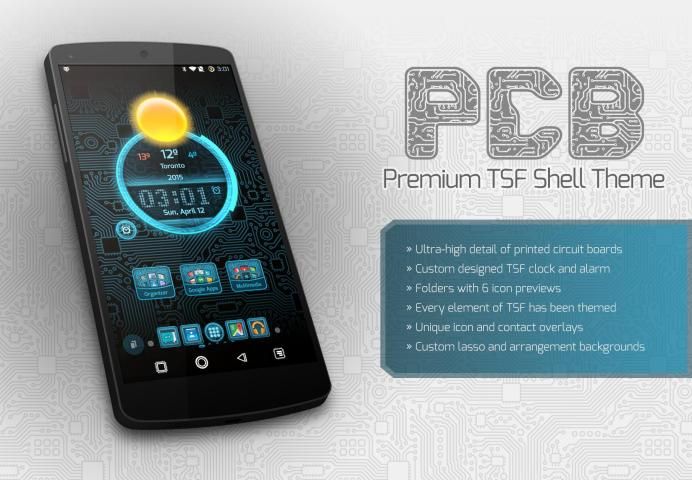 Tema PCB ini telah dirancang dengan penuh perhatian terhadap detail. Gambar yang tajam pola papan sirkuit menghiasi banyak elemen grafis TSF Shell. Banyak fitur yang disertakan: