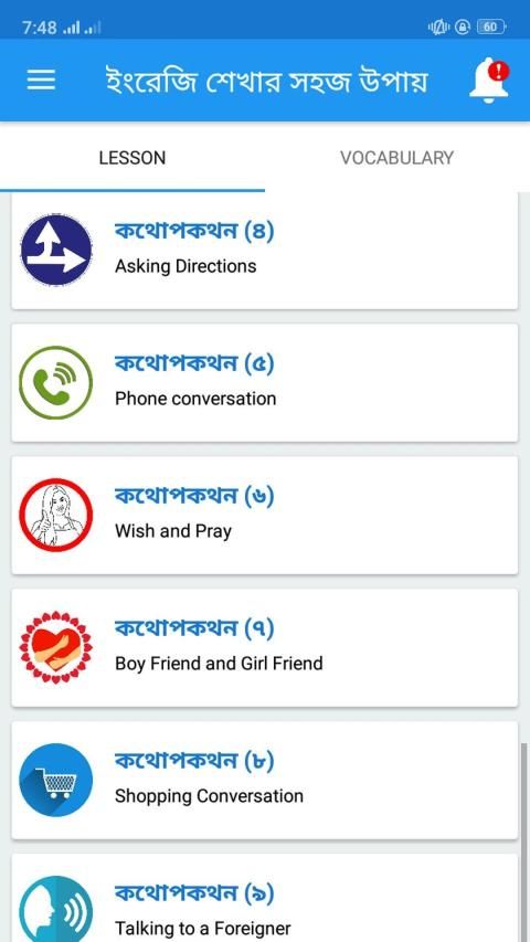 আপনি কি ইংরেজিতে দুর্বল? চিন্তা করবেন না! আমরা আপনাকে একটি চমৎকার স্পোকেন ইংলিশ অ্যাপ্লিকেশন দেব। আপনি সহজেই এই অ্যাপ্লিকেশনটি ব্যবহার করে ইংরেজী কথোপকথন শিখতে পারেন। এর মধ্যে প্রতিদিনের প্রয়োজনীয় ইংরেজি বাক্য, সাধারণ বাক্য এবং শব্দ অন্তর্ভুক্ত থাকে। আপনি যদি আমাদের প্রতিদিনের কিছু কথোপকথন এবং শব্দভাণ্ডার পড়েন তবে আমরা আপনাকে আশ্বস্ত করি যে আপনি ইংরেজী বলতে পারবেন।