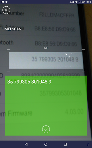 You can enter the IMEI (Open dialpad and enter *#06*) with number from keyboard or scan number by camera.