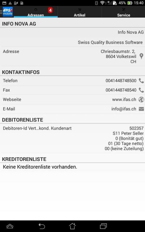 iFAS mobile ist die innovative App, um die ERP-Lösung der Info Nova AG zu mobilisieren. Stellen Sie eine Vielzahl von Funktionen aus dem ERP für den Aussendienst zur Verfügung und ermöglichen Sie so ein einfaches, effizientes Arbeiten. Verkäufer, Monteure oder Servicetechniker können wichtige Kunden-, Anlagen- oder Geräteinformationen abrufen oder Serviceleistungen rückmelden bzw. weitere Informationen erfassen.