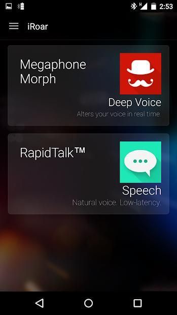 The iRoar Megaphone dilengkapi dengan menakjubkan Megaphone Morph, yang langsung dapat mengubah suara Anda menjadi karakter yang berbeda, untuk membuat Anda terdengar seperti orang yang sama sekali berbeda. Coba suara menyenangkan atau efek suara seperti Pria, Wanita, Kid, Lansia dan Demon. Cukup tekan pada karakter yang tersedia pada aplikasi dan berbicara ke Anda iRoar Mic!